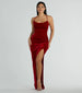 Showcase an elevated and chic style in the gorgeous Riley ruched velvet formal dress! She features a sleeveless cowl neckline. spaghetti straps that lead to a cross-back design. a hip-hugging silhouette with ruching at the waist. and a floor-length hem with a sultry thigh-high front slit. The velvet fabric gives off a luxe vibe. Complete the look with strappy heels and an embellished evening bag.