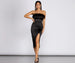 She's Sleek. and she's polished and we love! Designed with a strapless straight neckline. with a removable faux fur trim. a form fitting bodice and that has padded cups. and a horizontal stitching at the hem mid waist. Her bodice leads to skirt high waist and leads down to a mid calf length with a high slit feature. Dress is composed of a satin material that offers slight stretch.