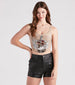 Take on the persona of an edgy rock and roll babe with this trendy graphic tank! It features a sleeveless scoop neck and back. thin tank shoulder straps. a guitar. roses. and wings graphic with the script. "Hard Rock Festival." and "Rock & Roll." and a fitted. cropped hem. Style this faux suede tank with faux leather shorts and ankle booties!