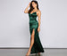 Sleek and chic. the Rosie satin mermaid dress will have you looking absolutely stunning! She features a sleeveless V-neckline with pleated detailing at the bust. adjustable spaghetti straps. a deep V-back design. and a fitted floor-length mermaid silhouette with a sultry thigh-high front slit. Style this formal dress with rhinestone statement earrings and heels.