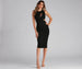 For looking sultry and sleek! Sammy is a class act and full of surprise in her sleeveless crew neck style with front and side sultry cutouts and a chic wrap-style bodice. Her curve-hugging silhouette ends below the knee to elongate your figure while the back slit accent adds extra detail. The formal dress is composed of a crepe texture knit fabric with a moderate stretch. Finish the look in stiletto heels and a rhinestone bracelet.