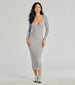 The ribbed knit dress features a sweetheart neckline with a twist accent at the bust. long sleeves. and a midi-length hem. Channel a casual vibe with chunky sneakers.