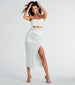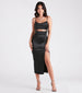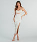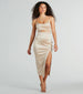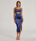Radiate elegance in a formal dress that showcases your timeless style! Seona features a pleated cowl neckline. spaghetti straps. a cutout at the midriff. and a midi-length silhouette accented with a high side slit. The dress is composed of a silky-satin fabric that offers a form-hugging fit with a moderate stretch. Complete the look with rhinestone heels and a clutch.