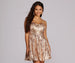 Bring the shine in this shimmering skater dress! It features a sleeveless bodice. a sweetheart neckline. spaghetti straps. a built in no slip strip. padded cups and a flared mini length skater silhouette. The all over gleaming sequins are set in a scroll print pattern. Dress is composed of a lined mesh fabric that offers a relaxed fit.