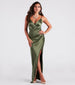 Sleek with chic sophistication. the Serena satin formal dress will bring the wow factor to your next fancy affair! She features a sleeveless V-neckline with a pleated wrap-front design. spaghetti straps. a high waist seam with stylish pleating. a floor-length hem with a wrap-front skirt creating a high side slit. and a figure-flattering. slim-fit silhouette. The silky-smooth satin-knit fabric gives off the most gorgeous sheen. Complete your look with a rhinestone necklace and earrings set.