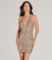 Sparkle all night in the Shay sleeveless dress featuring a sultry halter V-neckline. a bodycon silhouette. and a mini-length hem perfect for styling with heels. The sequin embellished mesh fabric offers a dazzling shine and a stretchy knit lining.