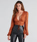Dare to be a bold vision in this sequin crop top perfect for going out! Designed with peasant long sleeves. a sexy plunge V-neckline. a satin lace-up front and ruched crop hem. and sequin-embellished mesh fabric that gives off a shimmer. Complete the look in sleek flare pants for dinner and dancing!