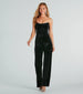 Keep your party 'fits luxe and elevated with this stunning velvet corset jumpsuit. Designed with a smooth velvet fabric. this sultry jumpsuit features a strapless angled neckline. a corset-style bodice with piping. a high waist seam. a hip-hugging fit. and a wide-leg silhouette. Complete your dressy party look with rhinestone fringe earrings and stiletto heels.