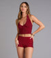 Made for the spotlight—this halter crop sparkles with rhinestones and a plunging V neckline that keeps things sultry. Pair with the matching shorts.