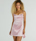 Show off that flirtatious flair in this sleek satin A-line mini dress! It features a sleeveless sweetheart neckline. spaghetti straps. a fitted bodice and waist with ruching. a mini-length asymmetric hem with a longer design on each side. and an A-line silhouette. The satin-knit fabric has a moderate stretch. Style with rhinestone fringe earrings and metallic heels!