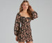 Show your florals off in this chiffon mini dress for your next girl's day! It features long peasant sleeves. a sweetheart neck with a front knot-tie and keyhole accent. and a smocked short-length hem. Complete the look in chic sunglasses and heels.