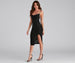 You'll look simply stunning in this chic midi dress that is perf for date night. It features a sleeveless bodice. spaghetti straps that lead to a cross-back design. a trendy cowl neckline. and a fitted mid-length silhouette with a sultry front slit. Complete the outfit with sparkly earrings and new heels.