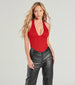 The corset top features a ponte knit fabrication. a plunging halter neckline. structured underwire. flexible boning at the bodice. and a cropped hem with a snatched form-hugging fit. Complete styling with a pleated skirt.