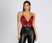 Get that sleek and sultry look with a bit of chic with this on trend satin-like bodysuit! It features a sleeveless bodice. adjustable spaghetti straps. a plunging V neckline with a tie closure. a front cut out. a stretchy square back. and a knit thong bottom with snap button closures.