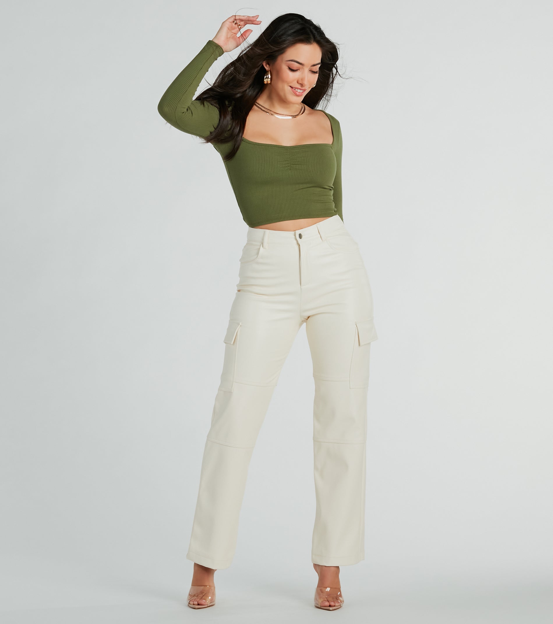 Capture those edgy-chic vibes in these sleek straight-leg faux leather cargo pants! The smooth faux leather fabric will level up your favorite casual 'fits. The high waist leads to a straight-leg silhouette for a relaxed look. The pants feature front and back pockets and cargo-style flap pockets on each side that add that trendy touch. Complete your look with a crop top and mules for happy hour.
