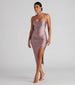 Show off major sleek style moves in this gorg sleeveless midi dress! It features a scoop neckline. spaghetti straps that lead to a cross-back design. side ruched detailing leading to a thigh-high slit. and a midi-length. curve-hugging silhouette. Complete the look with clear heels.
