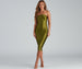 Keep it sleek and stylish in this on-trend midi dress! It features a sleeveless halter neckline with tie-back spaghetti straps. ruching at the bust. and a mid-length. fitted silhouette. Complete the look with a faux leather jacket and clear mules.