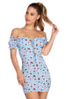 Keep it sweet in florals! This pretty light blue dress features an off the shoulder neckline with ruffled trim. a sweetheart bust with a small tie front keyhole and short sleeves. The relaxed fit bodice features a smocked back and leads to a curve hugging mini length silhouette. The all over dainty floral print features pink and red hues. Dress is composed of a lightweight woven fabric that offers minimal stretch.