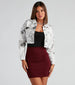 You love being extra! This cropped denim jacket is a must-have statement piece for your wardrobe. Featuring a collared neckline. long sleeves. a button-down front. and an all-over newspaper print pattern. this jacket will have all eyes on you. Style with a basic bodysuit and a bodycon mini skirt.