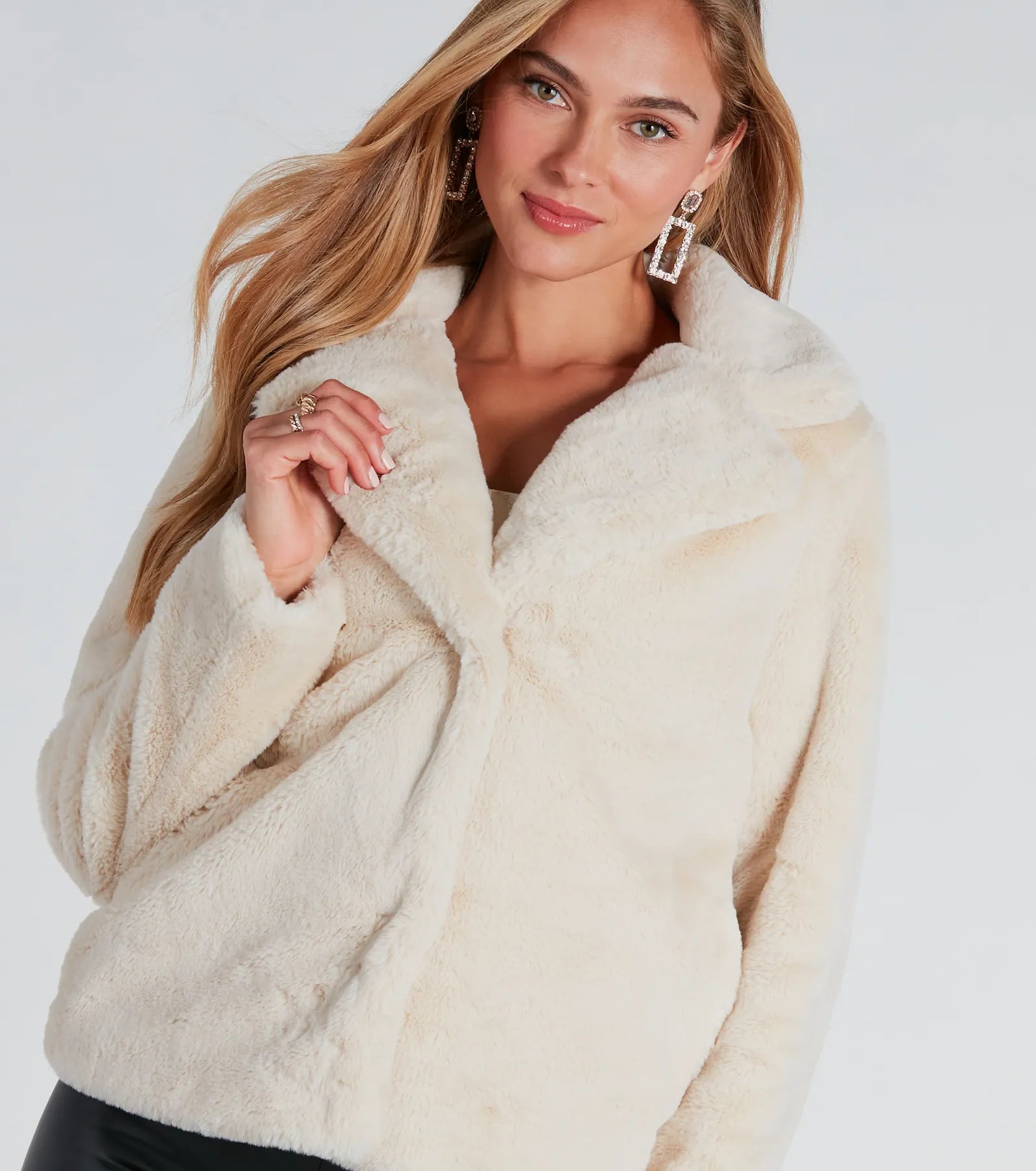 Keep cozy and oh-so-luxe in this faux fur jacket for the chilly season! It features long sleeves. a collar neckline. hidden front snap-button closures. and side pockets for keeping your hands warm. and is crafted from a soft faux fur fabric with a smooth satin lining. Complete the look in a sweater midi dress for dressy dinner parties!