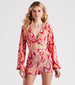 Create a fab retro look for spring break with this trendy printed crop top! It features a deep V-neckline with a twist-front design. long peasant sleeves with cinched hems. a fitted cropped hem. and an all-over eye-catching swirl print pattern. The lightweight plisse woven fabric includes a front knit lining. Style with the matching shorts and clear mules.