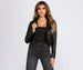 It's all in the zipper details! This moto jacket is a must for a chic and sleek vibe. Layer this jacket for a night out with the squad. The jacket features an asymmetrical zipper front. small zippered pockets. zipper details on the shoulder. a cropped. form-hugging fit. and is composed of faux leather fabric. Complete your look with high waist denim jeans and sleek hoops.