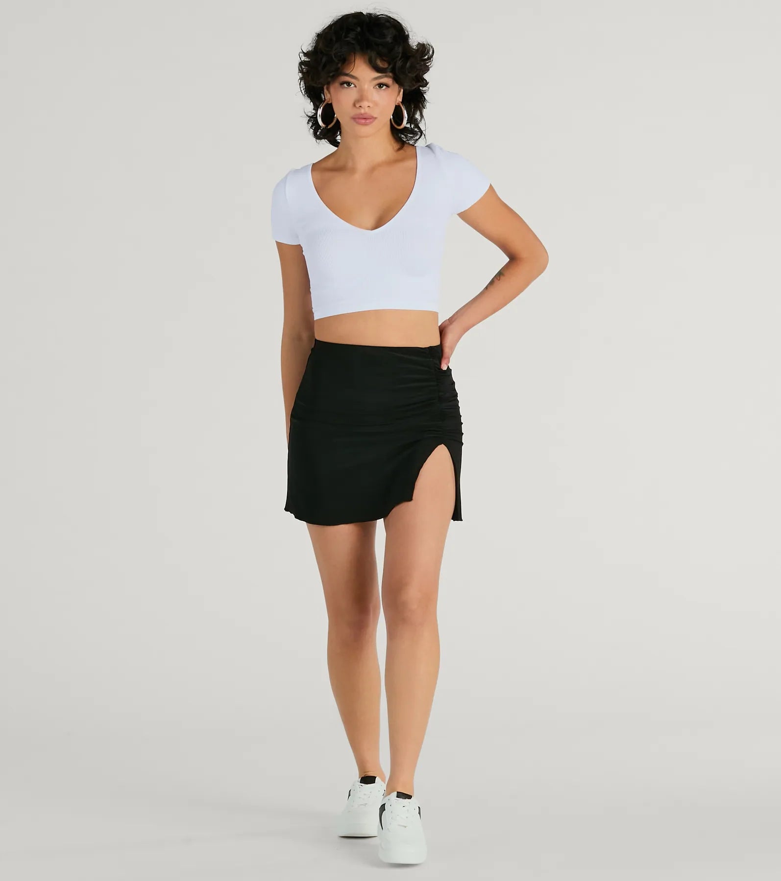 You'll be looking like a solid ten in this bodycon mini skirt perfect for going out! The high-rise waist and front ruched seam create a flattering fit while the slit adds a touch of sexy. The bodycon fit and mini-length hem make this the perfect statement piece! Complete the look in high heels.
