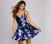 Bring the charm in the gorgeous Sophie dress to make an impression! She features a sleeveless bodice. a V neckline. padded cups. vertical princess seams to complement curves. adjustable spaghetti straps and a lace up back to easily adjust. Her slim fit bodice leads to a flared party length skirt with hidden side pockets. Her all all over floral print is all you need to radiate an enchanting look. Dress includes a petticoat and back zipper closure with a hook and eye closure. Dress is composed of a lined textured satin fabric that offers a form hugging fit with a minimal stretch.