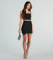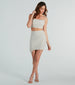 Sparkle all the way to the party in this glitter mini skirt that radiates shine! The mini skirt features a high-rise waist. a bodycon silhouette. and a wrap-front hem. The glitzy glitter knit fabric offers a moderate stretch. Style with the matching crop top to complete the look!