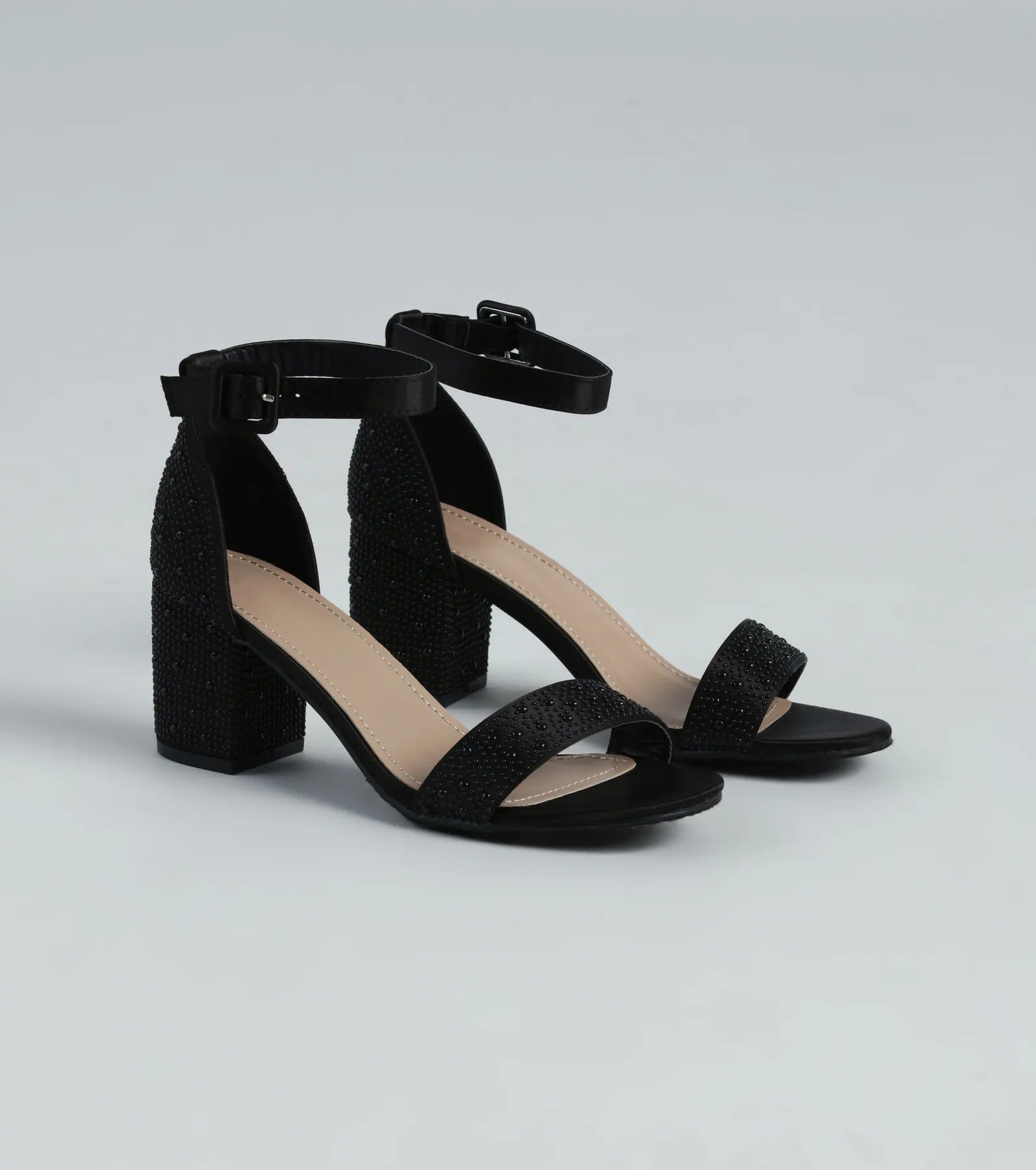 These pearl and rhinestone block heels are for the girlies who love that sparkle! They feature an open almond toe with a strap. an adjustable ankle strap with a square-shaped buckle. a closed back. a short block heel. and mini rhinestone and faux pearl embellishments for a cool-glam vibe. Style these heels with a sleek clutch for your next night out.