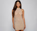 Dazzle in a mini dress that is major sparkle goals! The dress features a sleeveless mock neck. an unlined bodice. sparkling heat stones throughout. and a mini-length silhouette. Complete look with an adhesive bra and mules. The dress is composed of a partially lined mesh fabric that offers a form hugging fit with a moderate stretch.