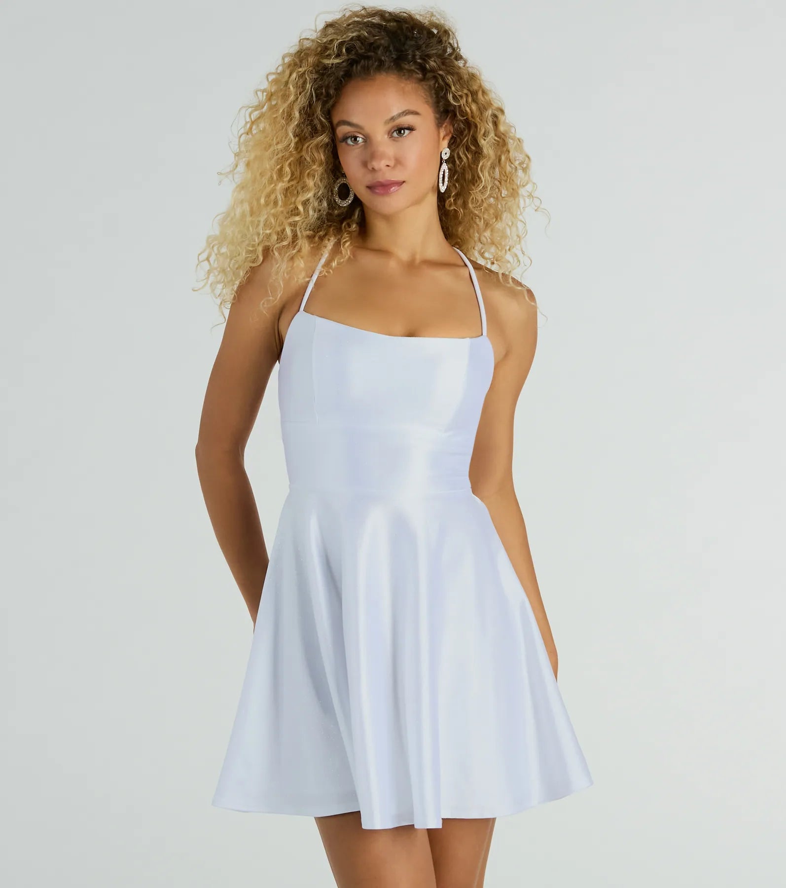 Be the sparkling sensation at the party in this glitter satin dress perfect for the dance floor! It features a sleeveless square neckline. a padded bust. adjustable spaghetti straps that crisscross in the back. a flattering skater silhouette. a short-length hem. and a sassy lace-up back design with tie closure. Complete the look in platform block heels.