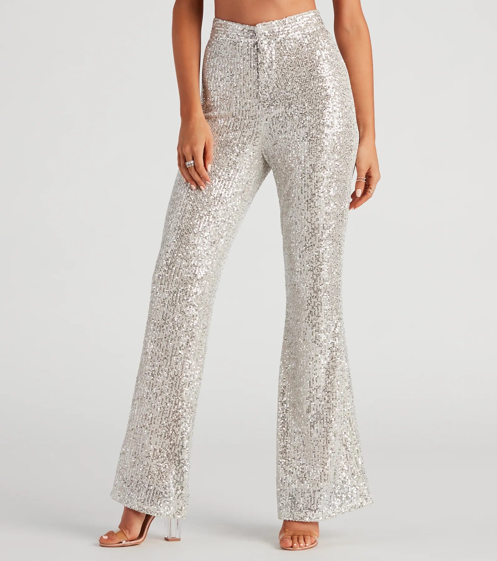 Put on a stunning show of sparkle in these dance-floor-ready sequin flare pants featuring a high-rise waist. hidden front zipper and hook-eye closure. and a hip-hugging silhouette with a flared hem. Complete the look in a tie-front top for a night out!