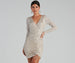 Sparkle up the night in this gorgeous embroidered mini dress. It features a V-neckline with a wrap-front design. long sleeves. front ruching with an adjustable drawstring. and a mini-length. form-hugging fit. The knit fabric features all-over sequin embroidery. making this dress a perf option for your NYE parties. Complete the look with sparkly heels.