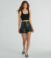 Weekday or not. spice things up in this faux leather skort! Â Featuring a high-rise waist and an asymmetrical front skirt overlay with ruffle trim. this skort will add a touch of flair to any outfit. Its form-hugging fit and shorts lining provide comfort and confidence. Complete the look in a basic top and a sleek crop jacket.