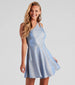 Radiate sparkle with every step on the Stacie glitter party dress made to shine all night! She features an eye-catching. cutout one-shoulder neckline with dual adjustable straps. princess seams along the bodice. a high waist seam. hidden side pockets to keep your hands warm. and a skater-style short-length skirt. The formal dress is composed of a metallic sherri glitter woven fabric with partial lining and no stretch. Complete your dressy look in stiletto mules and a clutch.