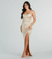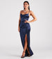 So sleek and stunning. the Stella satin formal dress will elevate your wedding guest. party. or dance look! She features a sleeveless cowl neckline. spaghetti straps that lead to a cross-back design. a high waist seam. ruching. a floor-length hem with a thigh-high front slit. and a slim-fit silhouette. The silky-satin knit fabric offers a moderate stretch. Style with a sticky bra and rhinestone earrings.