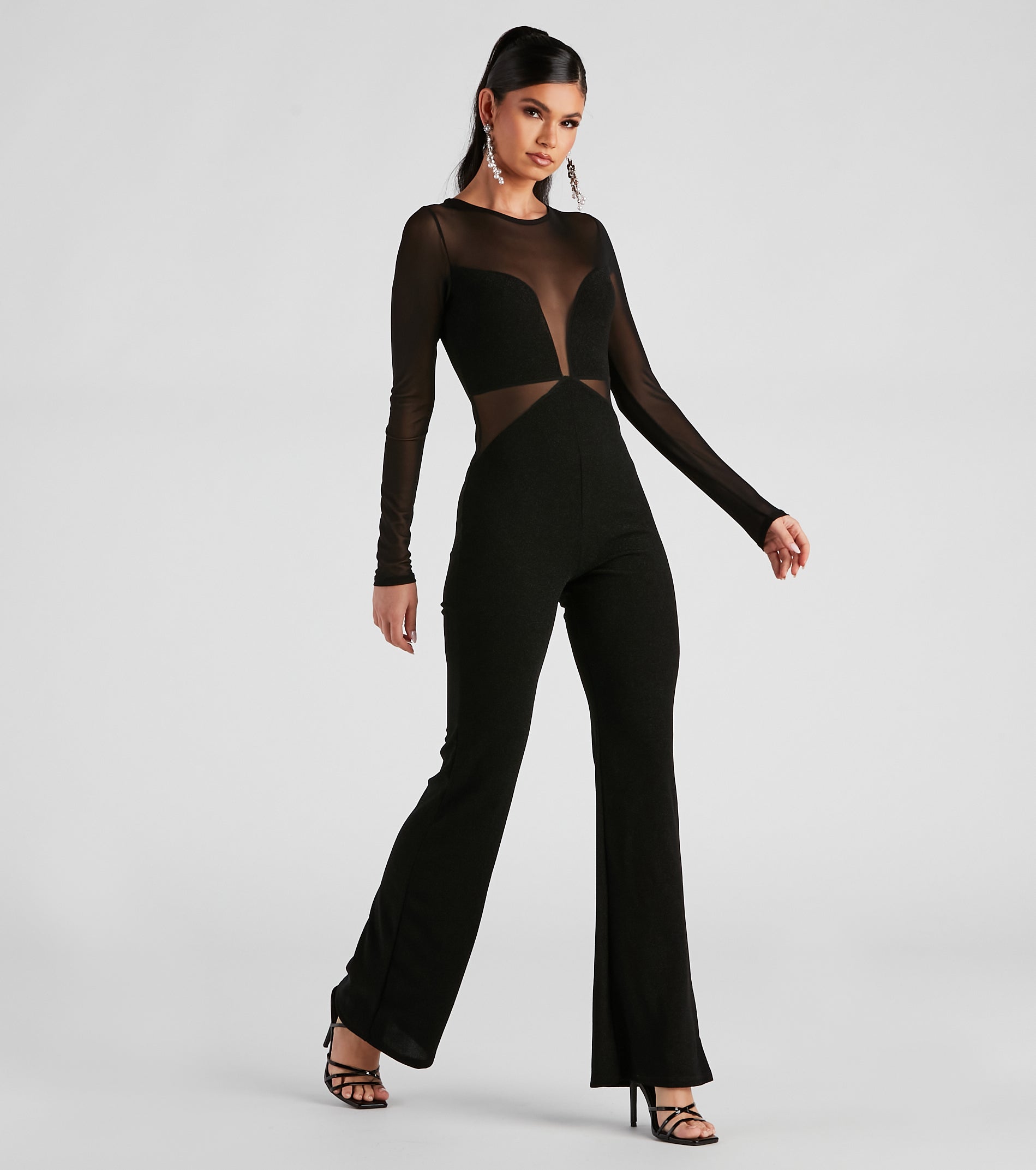 Everyone will remember how you stole the night in this glitter mesh jumpsuit featuring sheer long sleeves. a crew neck. a sweetheart-lined bodice. an open-back with tie closure. and a form-hugging. flare hem. Complete your look in statement fringe earrings for a stunning finish.