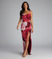 Serving petal power with every step. This floral print maxi stuns with a draped cowl neckline and a high front slit that brings the drama (and the legs).