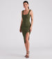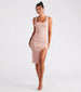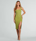 Strut it out in a knit midi dress that is perf for every day! Designed with a ribbed knit fabric. this dress offers a form-hugging fit with a moderate stretch. It features a sleeveless square neckline. tank shoulder straps. a high side slit accented with glossy metal buttons. and a midi-length hem. Complete the look with mules.