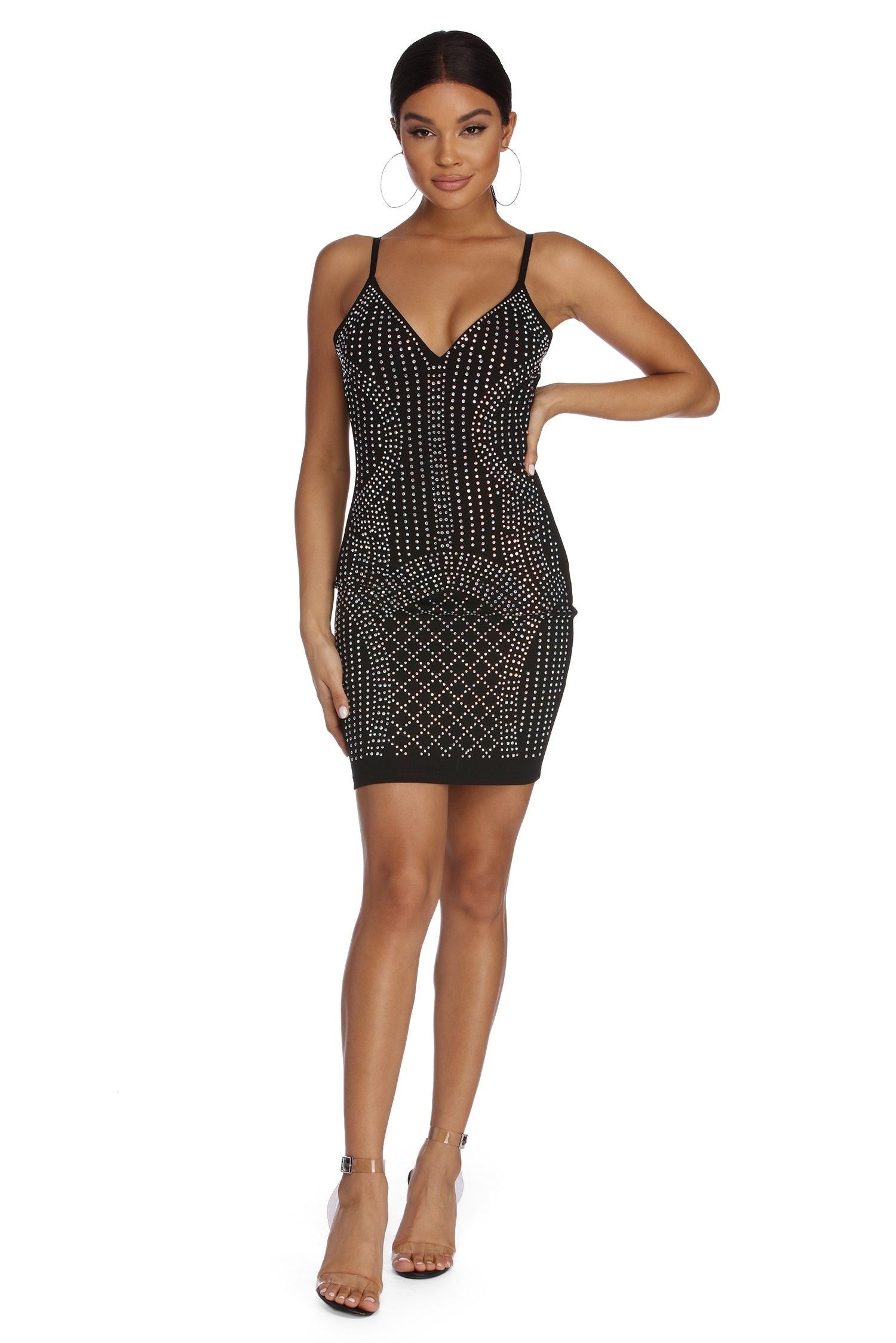 Stunt on the crowd with this flashy style! The sleeveless black dress has a plunging V neckline paired with adjustable straps featuring an elastic stretch and a sexy bodycon fit. The garment is composed of a lined knit that offers a moderate stretch. closes with a hidden back zipper and is detailed with sparkling heat stones for a glamorous look.