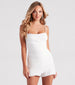 This crepe skort romper is style all-in-one cute and sassy package! It features a sleeveless square neck. spaghetti straps. and a front pleated bodice that leads to the asymmetrical wrap short hem. Complete the look in cute sandals for a date night!
