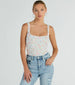 All of your outfits will be adorable when you style them with this floral bodysuit! Crafted from an eyelet floral printed knit fabric. this sleeveless bodysuit boasts a square neckline adorned with shoulder straps and a form-hugging fit. Complete the look with trendy distressed jeans and your favorite sneakers.