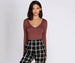 The everday essential you need to start off your cute 'fit. This top features a V neckline. long fitted sleeves. and a mid-length. form hugging fit. Garment is composed of a double layered knit fabric with plenty of stretch.