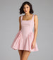 Channel your sugar and spice in this sleeveless skater dress at the school dance or dressy date! Â Designed with a square neckline and shoulder straps for a flattering fit. this dress also boasts a low-cut back with a tie closure for an added touch of flirtiness. The skater silhouette and ruffled sides create a playful and feminine look. while the short-length hem offers a modern style. Complete the look with jewelry and a clutch!