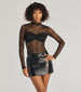 Flaunt a sultry allure in this rhinestone lace bodysuit in a sheer design that flaunts your figure! Style with a sleek mini skirt for a date night.