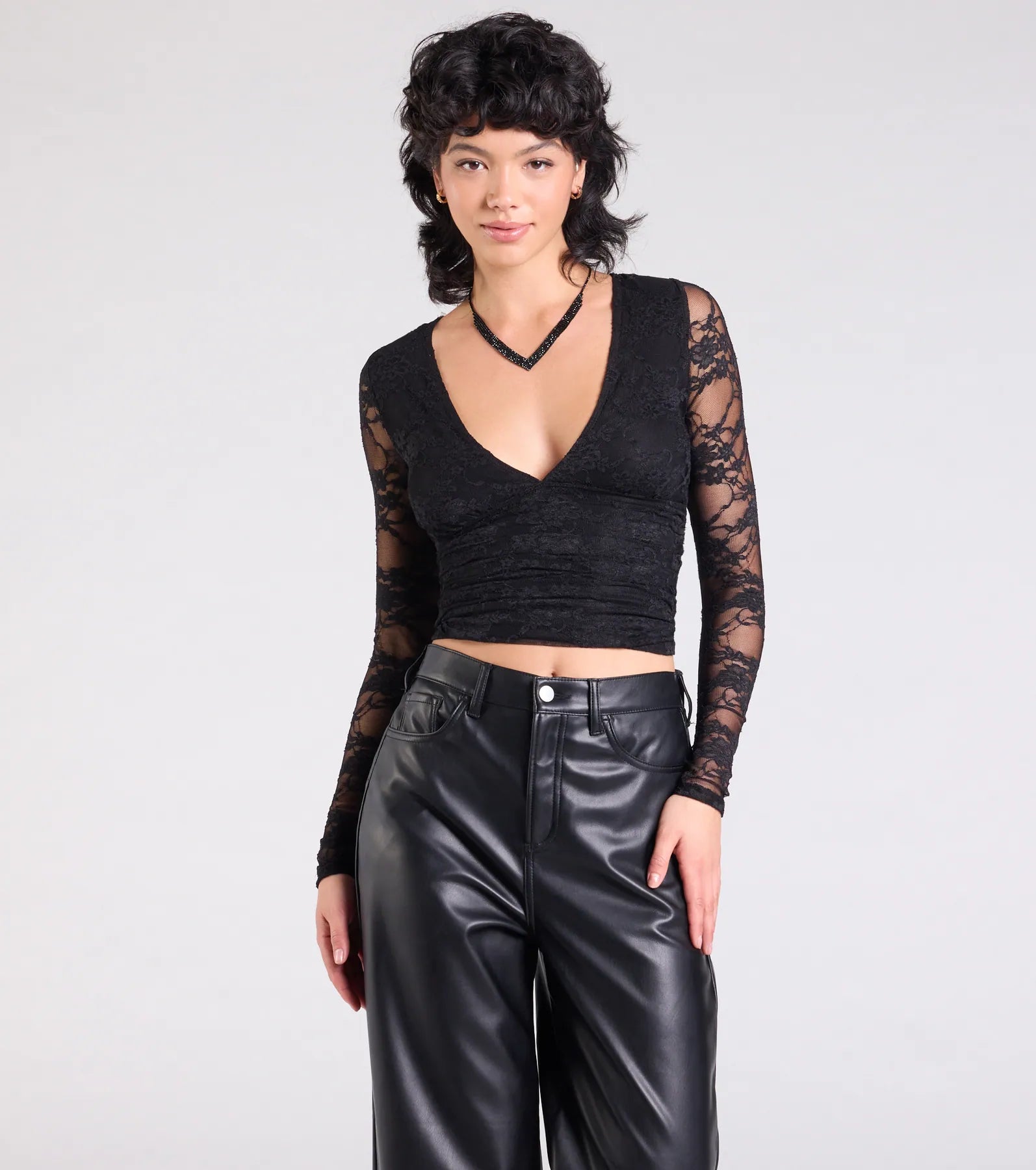 Sultry and chic. you'll fall in love with this lace top. Designed with sheer long sleeves and an open back. you'll turn heads and steal hearts your next night out.