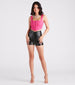 There's a fire burning for your sultriness in these hot faux leather shorts! They feature a flattering. on-trend. high-rise cross waist. fitted silhouette. and cheeky hem. Style with a sexy bustier and lace-up heels for a night on the town!