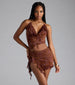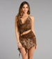 The mini dress features a paisley burnout pattern. a sleeveless halter neckline with a draped cowl bust. halter neck ties for an adjustable fit. an asymmetrical waist cutout accented with an O-ring. and a ruffled hanky hem trim. Complete night out outfit with chrome heels.