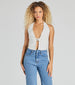 Sultry and on-trend. this crop top features a plunging V-neckline with a halter strap. an alluring open back. and a buckle strap design under the bust. The front slit and fitted cropped hem will highlight your waist. creating a snatched silhouette.